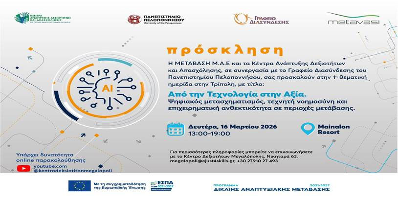 Είχαμε τη χαρά και την τιμή να είμαστε προσκεκλημένοι από το Κέντρο Ανάπτυξης, Δεξιοτήτων και Απασχόλησης Μεγαλόπολης στην 1η Θεματική Ημερίδα «Από την Τεχνολογία στην Αξία», που πραγματοποιήθηκε στην Τρίπολη τη Δευτέρα 16 Μαρτίου.